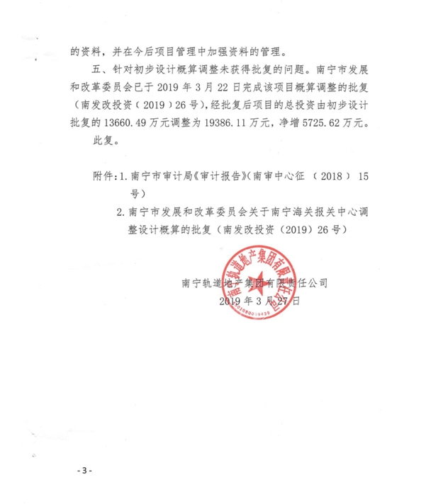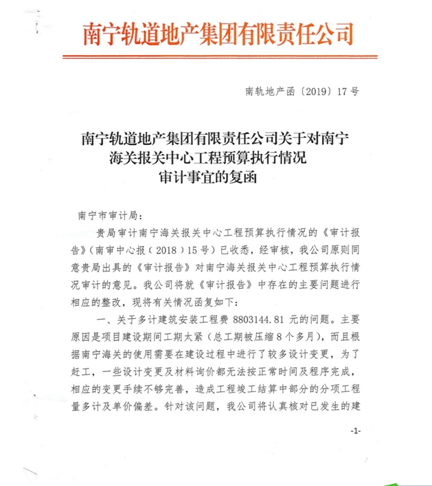 南寧軌道地產(chǎn)集團有限責任公司關于對南寧海關報關中心工程預算執(zhí)行情況審計事宜的復函