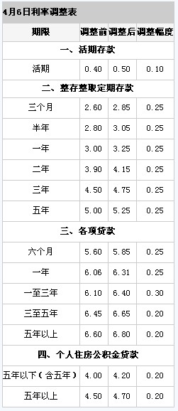 中國人民銀行決定,自2011年4月6日起上調(diào)金融機構(gòu)人民幣存貸款基準(zhǔn)利率。金融機構(gòu)一年期存貸款基準(zhǔn)利率分別上調(diào)0.25個百分點,其他各檔次存貸款基準(zhǔn)利率及個人住房公積金貸款利率相應(yīng)調(diào)整(見附表)。